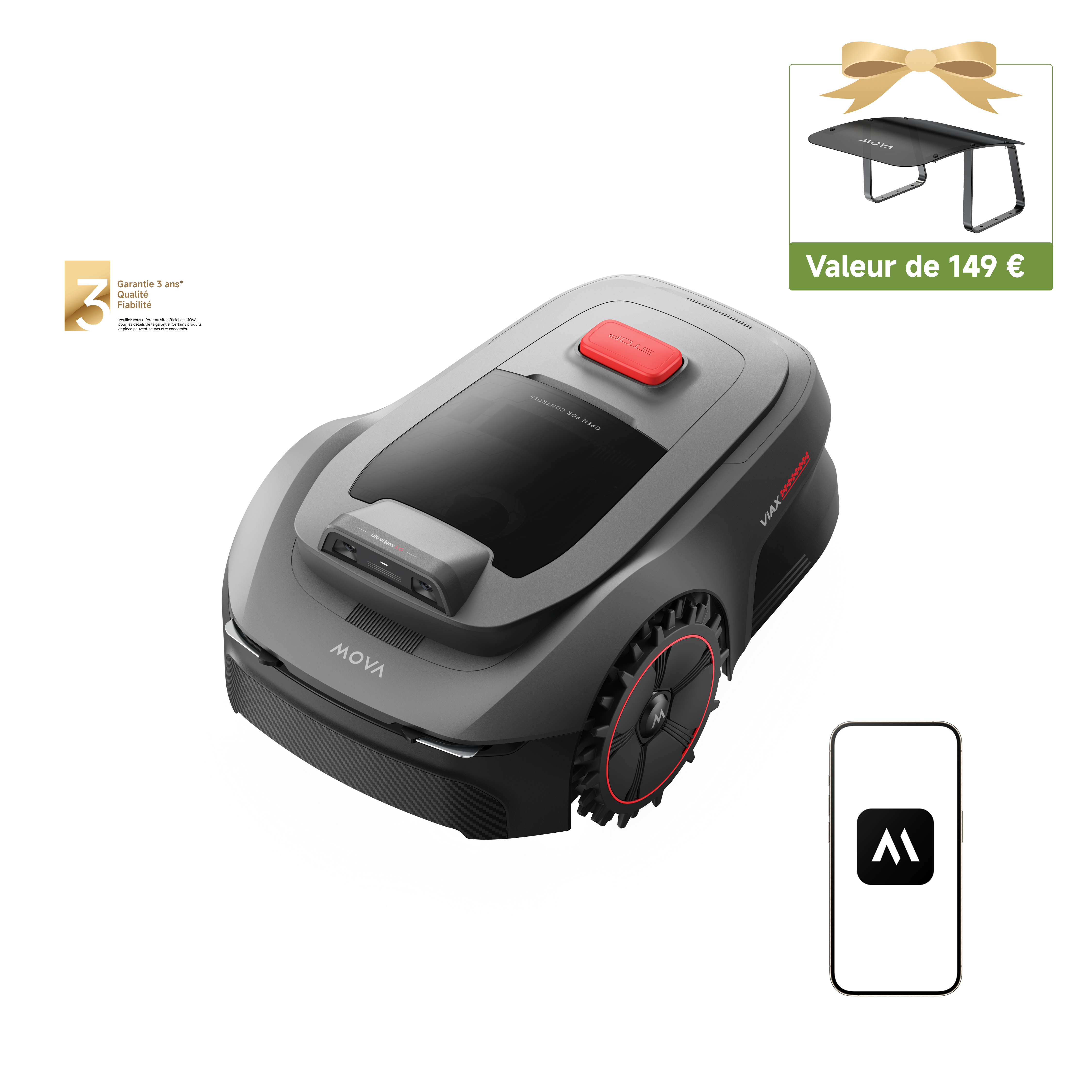 Grâce à la technologie UltraEyes™ 1.0, la tondeuse fait aussi office de système de sécurité pour protéger vos espaces verts via l’application MOVAhome, avec une protection des données certifiée TÜV Rheinland pour garantir votre confidentialité.